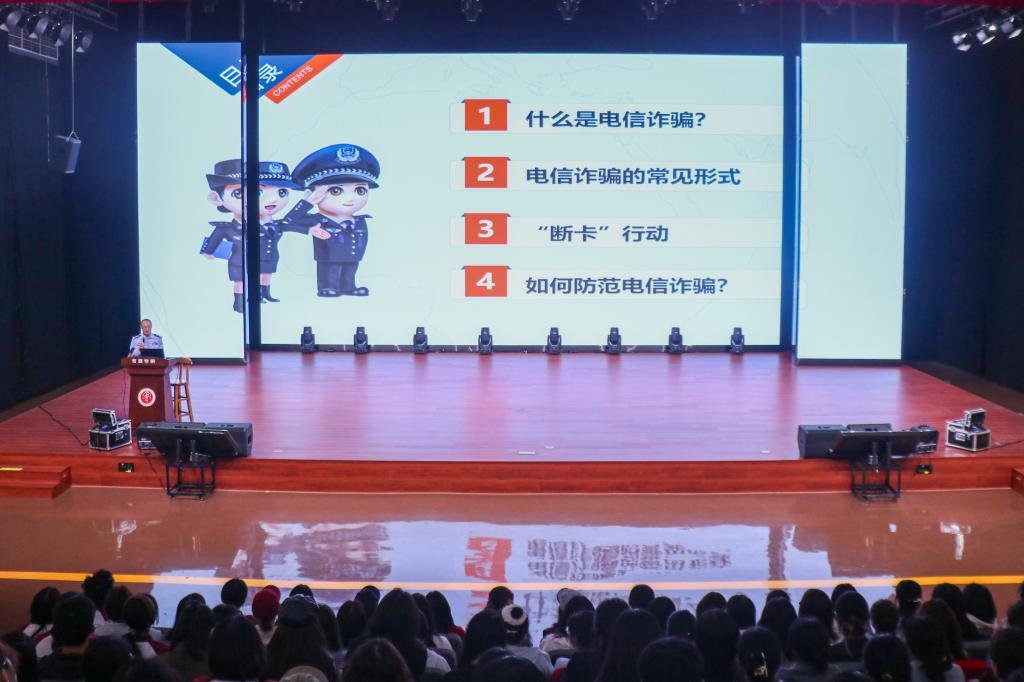 讲座开始,杨晓民警官围绕电信诈骗知识展开宣讲。杨晓民警官详细介绍电信诈骗的概念、特点及常见形式,并结合真实电信诈骗案件和自身办案经验,向同学们传授防诈经验,提醒同学们提高警惕,守护好个人信息与财产安全,避免落入电信诈骗的陷阱。随后,文丹从国家安全、抵御宗教渗透及反邪教、财产安全、网络安全、人身安全、消防安全、交通安全七个方面,结合真实案例,细致讲解各领域安全风险、防范措施及应急处理方法,进一步强调全方位安全的重要性。最后,文丹呼吁全体新生将安全知识内化于心、外化于行,不仅要自己提高安全防范意识,遇到安全问题第一时间联系辅导员或拨打学校保卫处电话,也要提醒身边同学共同维护校园安全。同学们认真聆听、积极互动,现场气氛十分热烈。